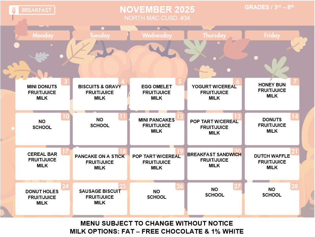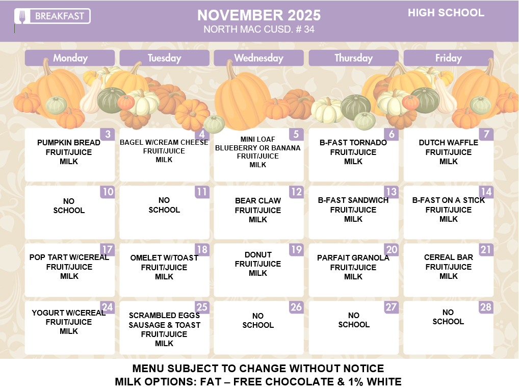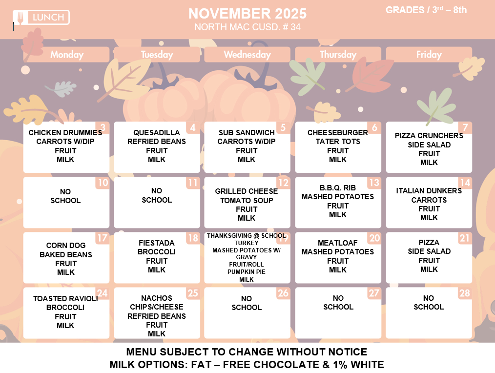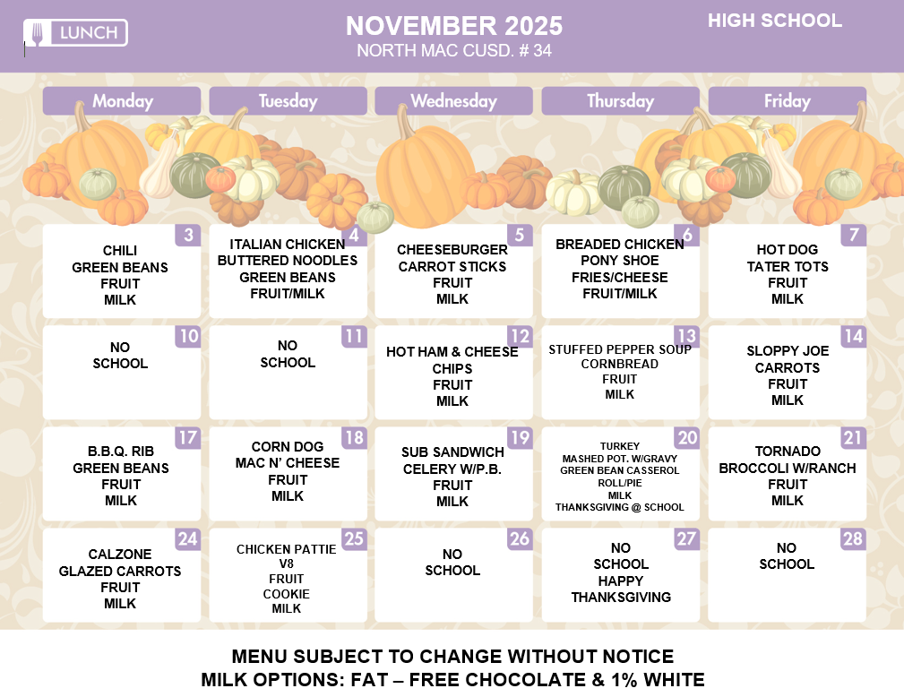 Pay attention to the menus. There is now a different menu for each of the 3 school locations. K-2, 3-8, and 9-12.